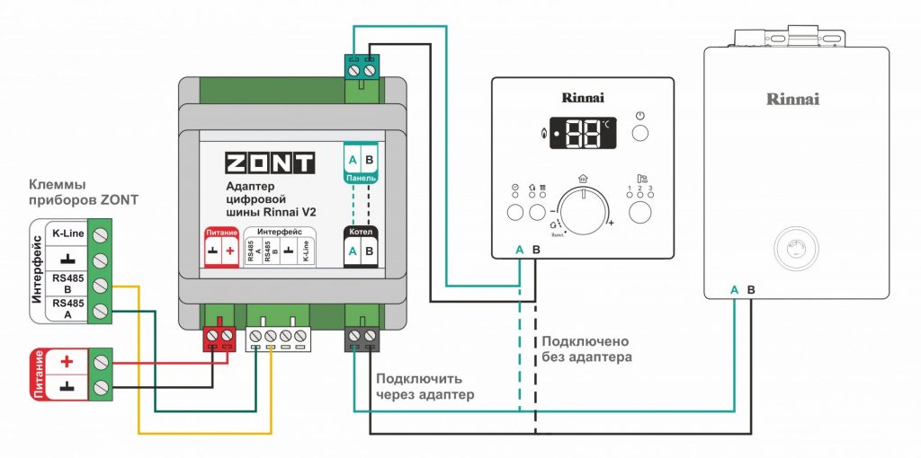 Важно! По цифровой шине работают не все котлы RINNAI. Проверьте совместимость работы конкретной модели с оборудованием ZONT в разделе Совместимость котлов с ZONT (перейти в раздел).