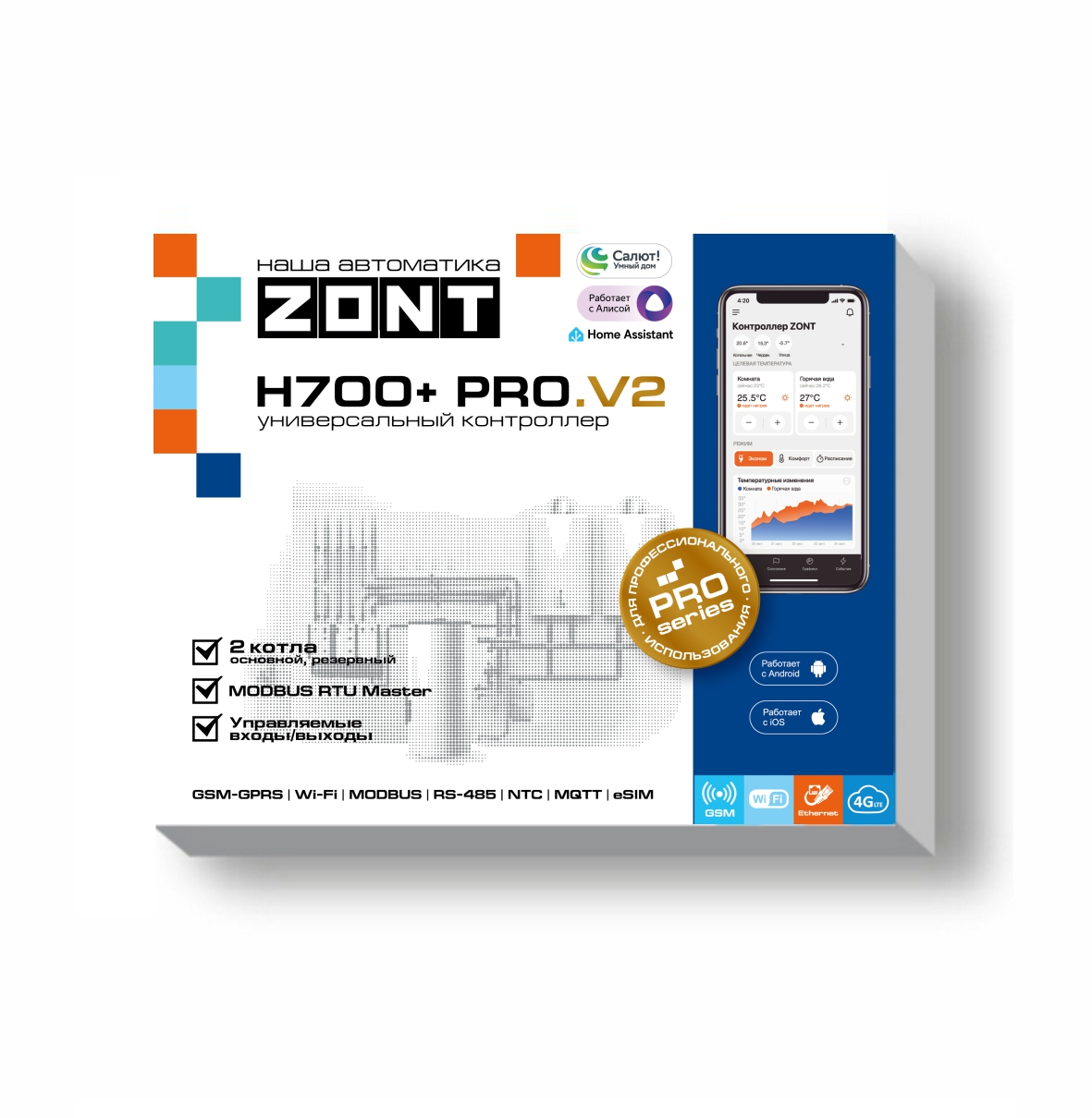 ZONT H700+ PRO.V2 — это обновленная версия универсального контроллера ZONT H700+ PRO для удаленного управления и автоматизации инженерных систем с поддержкой современных каналов связи (4G, Wi-Fi, Ethernet) и специальных протоколов Modbus RTU и MQTT, а также интеграцией в «Умный дом» (через Яндекс Алису, Сбер Салют, Home Assistant).